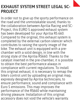 | Notes | OEM part on RS660 E5 Extrema. Not suitable for RS660 E5 35kw and/or other depowered bike versions. WARNING: a specific remapping of the vehicle is required, to be downloaded from PADS against a password release. |