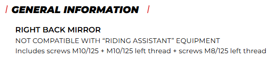 As for its adaptation to the motorcycle, the mirror can be attached to the motorcycle by means of a rod or it has adapters for the right-hand mirror (M10x1.25 with left thread) to mount it on the original fairing of the motorcycle.