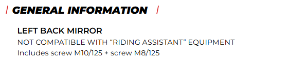 As for its adaptation to the motorcycle, the mirror can be attached to the motorcycle by means of a rod or it has adapters for the right-hand mirror (M10x1.25 with left thread) to mount it on the original fairing of the motorcycle.