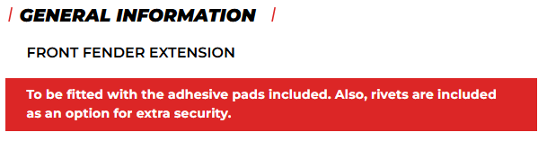 For its installation, PUIG provides rivets to install the fender extension to ensure a permanent attachment to the motorcycle's original mudguard. Only for reference 9203N - it is offered with glue for its installation.