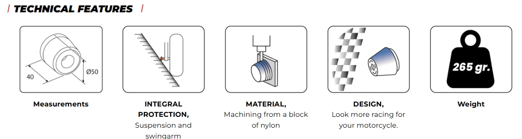 Machined from a nylon block, with a reduced weight of 265 gr and 40 mm long x 50 mm in diameter, it will be the perfect and integral protection for both the fork and the suspension.