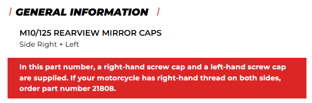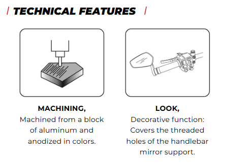 Its function is decorative: to cover the threaded holes of the motorcycle's original mirrors when mirrors are installed at the ends of the handlebars. In this way, the aesthetics of the motorcycle are improved and a more personalized look is achieved.